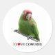A red masked parakeet aka cherry headed conure is shown with the words "I love conures" and the "O" in "love" is replaced by a little red heart