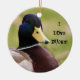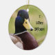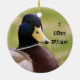 A blue & grey Duck with a yellow beck with words saying i love ducks makes a nice christmas Ornament.