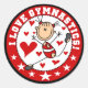 A stick figure girl gymnast in a red leotard with lots of red hearts and text that reads I Love Gymnastics on gymnast T-shirts, buttons, hoodies, mugs, bags, cards, buttons, keychains, keepsakes, and much more.