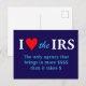 I Love the IRS on a postcard. The text reads I (heart) the IRS. The only agency that brings in more money than it takes. Images are copyrighted © Sandy Long, all rights reserved. Show your support for fiscal responsibility and stand against tax cheats and tax fraud. This design is on many other fun items in my Art Activism store.