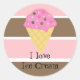 A fun design featuring a cherry ice cream cone with sprinkles. A striped neapolitan background of strawberry pink, vanilla white and chocolate brown. The saying can be changed as desired.