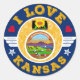 I Love Kansas State Map and Flag. Taking its inspiration from the state flag, this design features a blue and gold colour scheme, plus red hearts and white accents. This frames the central motif from the state flag, displayed with silhouette of the state flag behind the sunflower. With cool distressed typography featuring the phrase 'I LOVE KANSAS'.