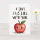 This sweet card combines cute graphics with fancy lettering to express love. At the top, the big words “I LOVE THIS LIFE WITH YOU” stand out in a textured, stylish script. Below, a friendly red apple with a green leaf and brown stem is painted with soft, colorful strokes. The white background makes both the words and apple pop, creating a cheerful, happy mood.