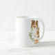 This adorable mug features a watercolor sheltie surrounded by a green laurel leaf wreath tied with a yellow bow and the text I love (heart) my sheltie.