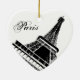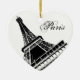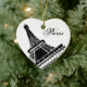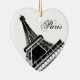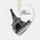 Customisable heart shaped ornament with black and white illustration of the Eiffel Tower in Paris, France.