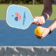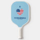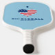This fun, stylish pickleball paddle features a rugged, distressed American flag heart over a light blue background. Text reads, "I 'heart' (Love) Pickleball" and a text template is included for personalisation, making this paddle a great gift! The back contains a full bleed matching American flag design.