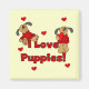 Two cute brown dogs dressed in red sweaters, red hearts, and red text that reads "I Love Puppies!" is featured on puppy dog t-shirts, mugs, tote bags, stickers, keychains, and more.