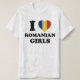 Celebrate the charm and beauty of Romanian girls with the 'Romanian Girls Fan Tee'. This shirt is a proud display of admiration, featuring a bold statement 'I ❤️ Romanian Girls' with a heart in the colors of the Romanian flag. It's a playful and loving way to honor the women of Romania, whether it's about heritage, a special someone, or the friendships you've made. This comfortable, white t-shirt is versatile and makes for great casual wear or a special gift. It's not just a piece of clothing; it's a way to connect with and show appreciation for Romanian culture and the unforgettable women who inspire you.