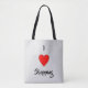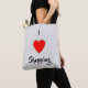 A simplistic white tote with a red heart, quote in black font reads "I Love (heart) Shopping" This sassy tote has a black handle. A perfect gift for a woman who is addicted to shopping.