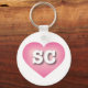 This keychain features a calm, cool, and collected pink heart with a white washed center containing the bold white upper case letters SC, the official abbreviation for South Carolina,, the palmetto state.