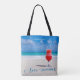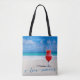 Personalised all-over-print beach bags with custom photo and custom text, where you can add your name and sign I Love Summer. Tote bag is made of polyester and measures 16 inches by 16 inches and the strap measures 28 inches.