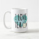 This cute and unique mug design features the words "I Love Tea" on an aqua coloured heart, and a small illustration of a steaming mug. The perfect gift for that special tea drinker in your life!