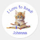 This cute little kitten says, I Love to Read! Here's an adorable watercolor tabby kitten, adorned with a flower crown of tiny blue flowers and one red ladybug, and doing her very favourite thing: Reading a book! The light blue text matches her blue ribbon bookmarker. All together, it's a soft, loveable image of a child's pure love of reading. Here it is on some stickers.