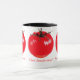 This Mug features an original design with three bright red tomatoes in a row at the top, and the sentence "I love tomato soup!" under the photos, in three languages: French, English and Spanish. The tomato in the photo looks "electrified", with the green stem and leaves made of zigzag lines, and a zigzag line white highlight on the shiny tomato red skin. These tomatoes are red hot, and this mug is great for tomato soup.