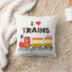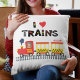 Does your little boy or girl love choo choo trains? If so, this custom bedroom or nursery throw pillow is perfect! Pillow has the text "I love (heart) trains" along with the first name of your kid. There's also a place for your little one's photo in the train locomotive conductor seat! Pillow is bright red and yellow and has touches of black and green. There are also passenger cars and a railroad track. This pillow makes a great personalised birthday, Christmas, or other holiday gift!