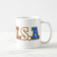 An American flag and hearts combine to make this cute patriotic graphic that says "I Love USA". Customise this design on your favourite mug.