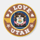 I Love Utah State Flag and Map. Taking its inspiration from the state flag, this design features a blue, white and brown colour scheme, and white hearts and stars. This frames the central motif of the state flag, the American bald eagle and US national flags, behind which is incorporated the state map. With cool distressed typography featuring the phrase 'I LOVE UTAH'.