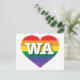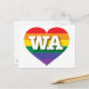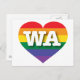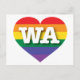 This postcard features a rainbow pride heart overlaid by the bold, white, capital letters WA, the official abbreviation for Washington, the evergreen state. The reverse side of the postcard is blank, awaiting your personalised sentiments or customised text. Show your true colours, support marriage equality, and celebrate gay pride.