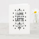 This Valentine's Day card features a black-and-white design with the message “I LOVE you a LATTE” centered on a white background. The words “I LOVE” sit above and “LATTE” sits below, both in large, all-caps serif letters in black. Between them, the smaller words “you a” appear in a flowing cursive style, also in black, with small arrow shapes on each side pointing inward. On the left and right of the main message, there are neat vertical rows of small black droplet shapes that hint at coffee drops and add a steady pattern. At the very top and bottom, matching curled flourishes frame the design like simple scrollwork. The overall look is sharp and balanced, with a cozy coffee-themed love note feel that’s easy to read and sweet 💕❤️. Hope it helps you share your Valentine’s Day feelings with someone you care about.