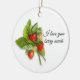 This ornament has a realistic vintage drawing of a strawberry plant. The ripe and unripe berries really stand out against the realistic shaded green leaves. You can change the text on the front and back. On the front it says "I love you berry much" on the back it says "Forever love, from (name)" You can also change the background colour. Other items with these pretty berries are in the vintage section of my store.