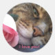 Pretty kitty (Lita) is laying down with a pink rose. Stickers says"I love you!" Very pretty and makes a great gift!