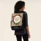 Personalised backpack with a fancy golden heart. Decorative swirls and shapes with the words "I Love You" written in fancy script font. Surrounded by a circle frame with a faux gold foil border. Behind the circle frame, are some pretty florals in red, pink and purple with green leaves. The background pattern is a classy marbled look in gold and tan.
