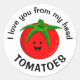 Cute fun red tomato with a happy smiling face and green leaves. Above and below the tomato in black text are the words "I Love You From My Head Tomatoes".