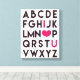 NewParkLane - Romantic Canvas, with the alphabet in modern, black typography and the letters for 'I Love You' highlighted in hot pink with a big heart.