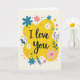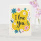 This card features the words “I love you” in deep indigo lettering, placed right in the center. The text sits on a sunny yellow shape that curves and stretches like a warm splash of paint, standing out against a creamy background. Around the edges, you’ll see stylized flowers in teal with fuchsia centers, along with soft pink blooms and white flowers with small red centers. Deep teal leaves and tiny golden florets fill in the gaps, giving the border a garden-like feel without crowding the message. Small dots in white, pink, and teal are scattered across the card like confetti, adding a light, cheerful touch. It feels meaningful because the message is simple and direct, and the bright colors make it feel like a little hug on paper 🥰. It’s a sweet way to say what you feel, whether it’s for a partner or someone you care about ❤️, and it’s easy to share Valentine’s Day sentiments.