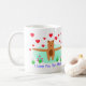 Love is in the air. This brown bear stretches his hand really long to say "I love you this much". Red hearts are floating around him. This is the perfect mug to express your love to your special one this Valentine's Day.
