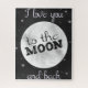 This romantic puzzle features a full white and silver moon on a black starry night background. The caption in modern black and white fonts reads "I love you to the moon and back".