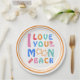 I love you to the moon and back round paper plate with an orange border. What a fun and colourful paper plate for celebrating a special occasion.