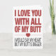My Butt Funny Valentines Card - Ah Valentines Day that sacred day for lovers all over the world. Celebrate your Valentine with this hilariously honest and quirky card: "I love you will all my Butt. I should say my heart but my butt is bigger" This card will hopefully melt the heart and tickle the funny bone of anyone who receives it. No butts about it.