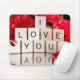 I Love You message with wooden tiles with a Joy word reflected in a mirror.