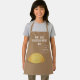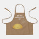 An apron that features a bread joke. The design asks “What does sourdough bread say?” And then the illustrated bread loaf below says “I’m a self-starter.” The apron’s colour scheme is brown and white.