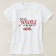 Tell the world that, Im too young to be this old, in a bold red and fancy font.