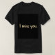 A T-shirt with the phrase "I MISS YOU" on a black background