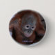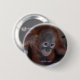 A little orangutan looks up at the camera from the lap of her human caregiver.