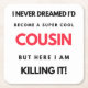 I Never Dreamed I'd Become A Super Cool Cousin But Here I Am Killing It design. This is a short funny quote which is great as an appreciation gift idea for Cousins. Also suitable as Cousin gifts for Christmas or Birthday.