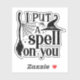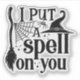 This classic Halloween design features the spooky phrase "I Put a Spell on You" in a bold, gothic-inspired font. The black and white colour scheme enhances the eerie atmosphere, making the design perfect for the Halloween season. Accompanying the text are iconic witchy elements, including a pointed witch's hat, a broomstick, a spider web, and a tiny spider, all arranged to create a bewitching composition. The subtle detailing of dots around the text adds a touch of magical charm.