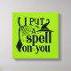 This classic Halloween design features the spooky phrase "I Put a Spell on You" in a bold, gothic-inspired font. The black and white colour scheme enhances the eerie atmosphere, making the design perfect for the Halloween season. Accompanying the text are iconic witchy elements, including a pointed witch's hat, a broomstick, a spider web, and a tiny spider, all arranged to create a bewitching composition. The subtle detailing of dots around the text adds a touch of magical charm.