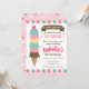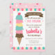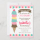 Here's the scoop: throw a super cool summer ice cream birthday party and beat the heat with this invitation! Features a totally sweet ice cream cone with chocolate, pink, blue, and yellow scoops. Perfect for any ice cream birthday party.