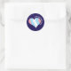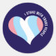 Show your support for the trans community with this round sticker featuring a heart in the trans flag colours and the text "I Stand with Trans People" around the edge of the heart. Use it to seal envelopes or stick on postcards to your government representatives!