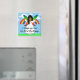 The magnet arrived in a timely fashion. I thought it was a nice size to be 2 inches by 2 inches. The magnet looks real nice on my refrigerator. The colors on the magnet were really nice and colorful. I saw all the colors on the rainbow used! I really liked that the Angel had tiny red hears on her white gown. The white clouds in the sky was nice also. The printing was good.