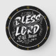 An inspiring art piece featuring the phrase I WILL BLESS THE LORD at all times in bold, stylised lettering. The text is rendered in white against a light grey background, framed by elegant scrollwork at the top and bottom. A beautiful item designed to offer encouragement and spiritual reflection.