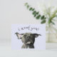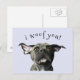 This is a watercolor painting of a black pit mix with floppy ears. It has pretty brown eyes. It says "i woof you" above the dog. Send this card to someone who loves dogs!
