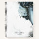 Blue, grey and black marble textured background. The back of notebook matches the front colour. You can change the font.