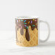 This custom coffee mug features a yummy looking ice cream cone design. The background is waffle cone pattern. Brown chocolate frosting drips with rainbow sprinkles is dripping from the top. A sample initial and name are printed below the icing which you can personalize to include your own name, or other custom text.