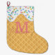 This custom Christmas stocking features a yummy looking ice cream cone design. The background is waffle cone pattern. White vanilla frosting drips with rainbow sprinkles is dripping from the top. A sample initial and name are printed below the icing which you can personalise to include your own name, or other custom text.