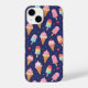 Pattern on blue background with creamy ice cream and popsicles, cherries and confetti floating around. Cute whimsical food design.